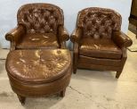 Pair of Pair of Leathercraft Arm Chair with One Ottoman, button tufted, has wear, one arm has small tear. Pair of Pair of Leathercraft Arm Chair with One Ottoman, button tufted, has wear, one arm has small tear.