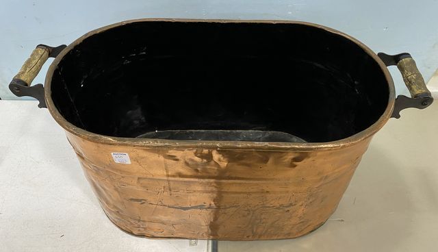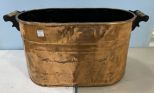 Vintage copper tub, handled, has dents, wood handles, 13"h., 26"w. Vintage copper tub, handled, has dents, wood handles, 13"h., 26"w.