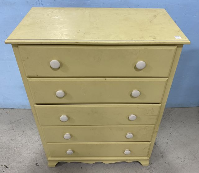 Lullaby Furniture Yellow White Chest of Drawers, 5 drawers, is dirty, 41"h., 31"w., 16"d. Lullaby Furniture Yellow White Chest of Drawers, 5 drawers, is dirty, 41"h., 31"w., 16"d.