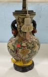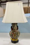 Floral ceramic urn pottery lamp, fruit handled, wood base, shade, 29"h. Floral ceramic urn pottery lamp, fruit handled, wood base, shade, 29"h.