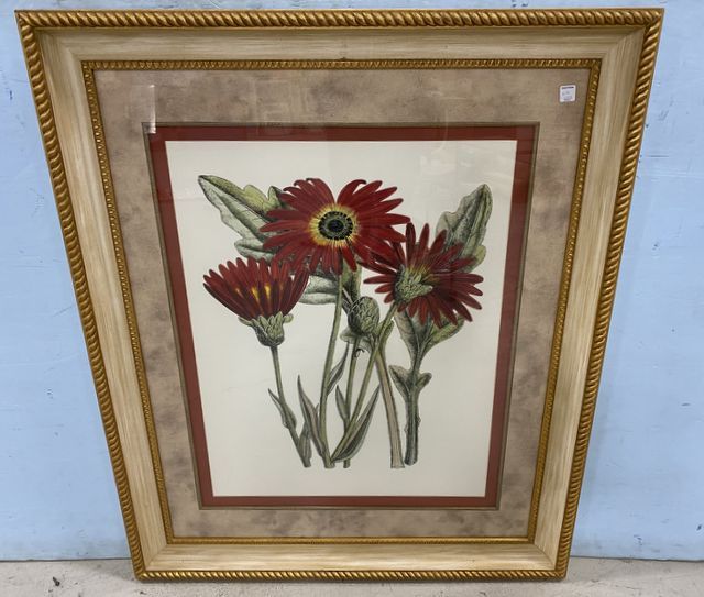 Large Flower Print, gold gild and painted framed, glassed, 46"h., 38"w. Large Flower Print, gold gild and painted framed, glassed, 46"h., 38"w.