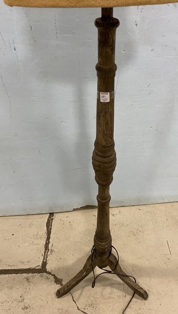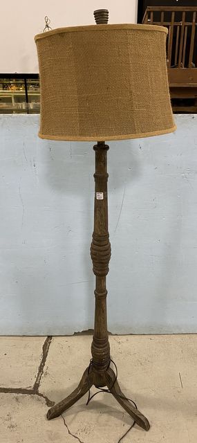 Decorative rustic style wood floor lamp, needs tightening, 60"h. Decorative rustic style wood floor lamp, needs tightening, 60"h.