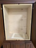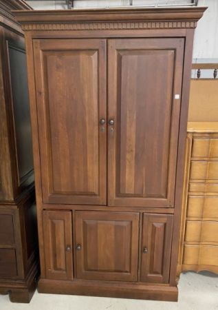 Modern Entertainment Center Armoire, cherry, has built in shelf display, one bottom slide out drawer needs adjusting, light wear, 81"h., 42"w., 21"d. Modern Entertainment Center Armoire, cherry, has built in shelf display, one bottom slide out drawer needs adjusting, light wear, 81"h., 42"w., 21"d.