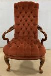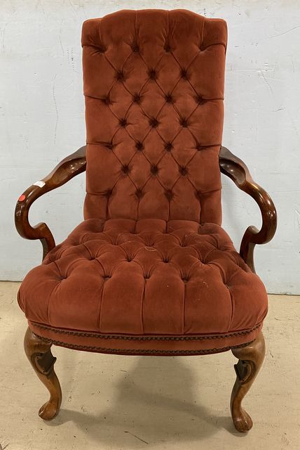 French Style Walnut Arm Chair, button tufted, red upholstered, 43"h. French Style Walnut Arm Chair, button tufted, red upholstered, 43"h.