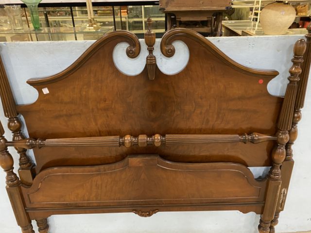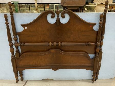 Burl Mahogany Full Size Mini Post Bed, on casters, has wood rails, Chippendale style. Burl Mahogany Full Size Mini Post Bed, on casters, has wood rails, Chippendale style.