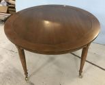 Round Oak Dining Table on wheels, has some finish wear on top, 27"h., 46"dia. Round Oak Dining Table on wheels, has some finish wear on top, 27"h., 46"dia.