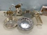 Group of silver plate serving pieces, pitcher, dishes, tray, party dish, candle holder, gravy. Group of silver plate serving pieces, pitcher, dishes, tray, party dish, candle holder, gravy.