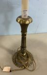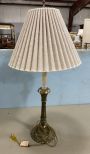Ornate Brass Candle Stick Lamp, with shade, good condition, 28"h. Ornate Brass Candle Stick Lamp, with shade, good condition, 28"h.