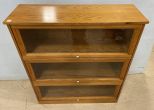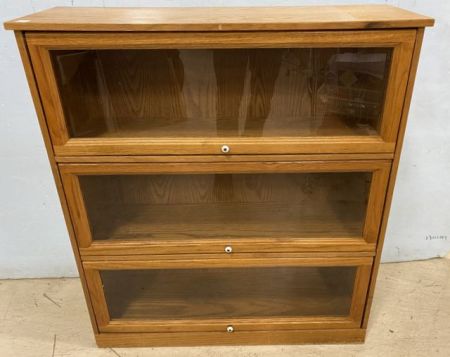 Pressed Wood Oak Barrister Bookcase, three section, glass sliding doors, has wear, a little loose, 41"h., 37"w., 12"d. Pressed Wood Oak Barrister Bookcase, three section, glass sliding doors, has wear, a little loose, 41"h., 37"w., 12"d.