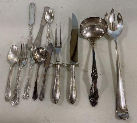 Group of Silver Plate Flatware, carving set, forks, ladle, serving spoon, butter knives, butter knife. Group of Silver Plate Flatware, carving set, forks, ladle, serving spoon, butter knives, butter knife.