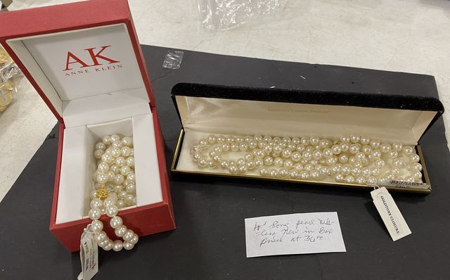 Two faux pearl necklaces, 8mm 30", in boxes. Two faux pearl necklaces, 8mm 30", in boxes.