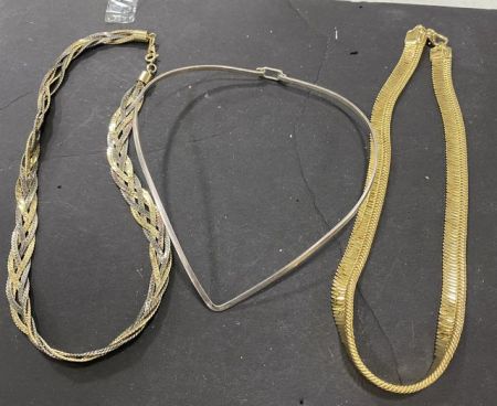 Three Costume Jewelry Necklaces, silver color choker, gold color necklace, gold and silver chain necklace. Three Costume Jewelry Necklaces, silver color choker, gold color necklace, gold and silver chain necklace.