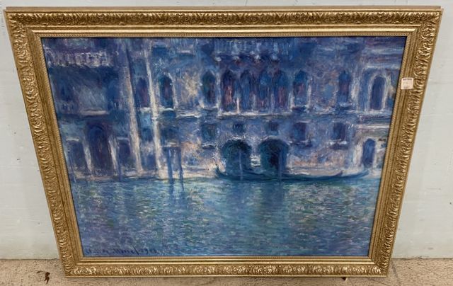 Italian Blue Boat Rower Print by Monet, on board, ornate framed, 27"h., 35"w. Italian Blue Boat Rower Print by Monet, on board, ornate framed, 27"h., 35"w.