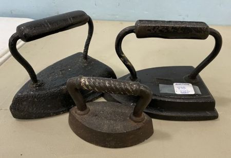 Three Antique Press Irons, number 7, and small ones. Three Antique Press Irons, number 7, and small ones.