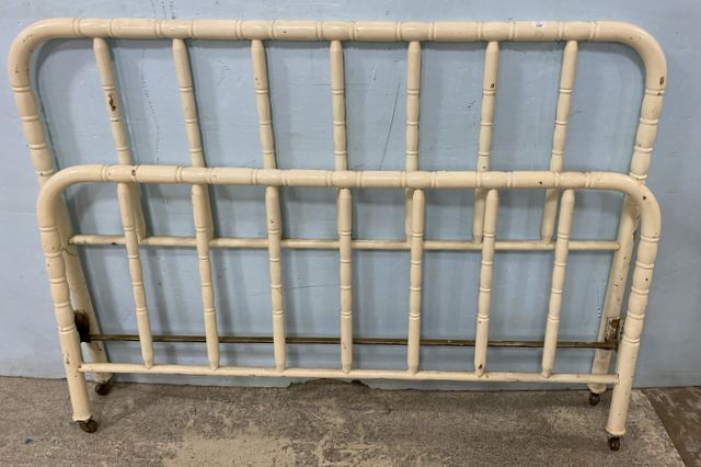 White Painted Iron Bed, no rails, on casters, 52"w. White Painted Iron Bed, no rails, on casters, 52"w.