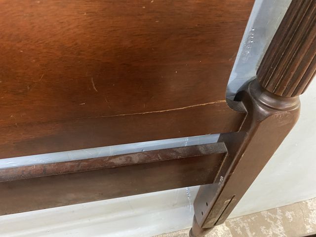 Vintage Mahogany Full Size Bed, has wood rails, has crack, on casters. Vintage Mahogany Full Size Bed, has wood rails, has crack, on casters.