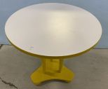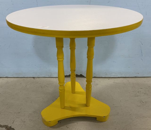 Pressed wood round lamp table, yellow painted pedestal base, white round top, 29"h., 30"dia. Pressed wood round lamp table, yellow painted pedestal base, white round top, 29"h., 30"dia.