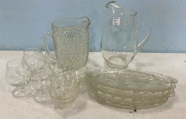 Group of clear glassware, diamond pattery pitcher, clear glass pitcher, luncheon plates and cups. Group of clear glassware, diamond pattery pitcher, clear glass pitcher, luncheon plates and cups.