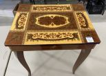 Mahogany Inlaid Music Jewelry Stand, has keys, legs removable, has damage at keyhole, 17"h., 14"w. Mahogany Inlaid Music Jewelry Stand, has keys, legs removable, has damage at keyhole, 17"h., 14"w.