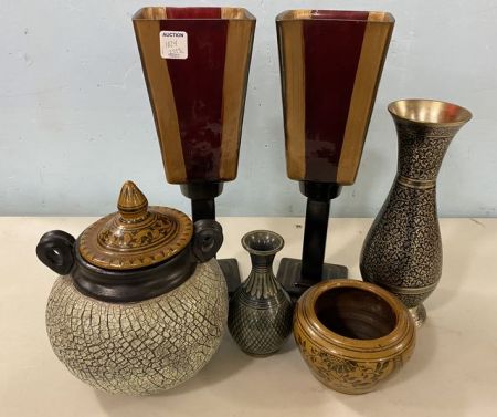 Group of pottery, three ceramic vases, metal ornate vase, pair of painted glass candle holders, 14"h. Group of pottery, three ceramic vases, metal ornate vase, pair of painted glass candle holders, 14"h.
