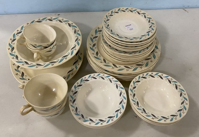 Homer Laughlin Partial China Set, 6 dinner plates, dessert plates, platter, bowl, cups, berry bowls, saucers, has chips. Homer Laughlin Partial China Set, 6 dinner plates, dessert plates, platter, bowl, cups, berry bowls, saucers, has chips.