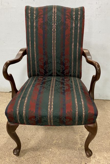 Queen Anne Upholstered Arm Chair, clean fabric, cherry frame. Queen Anne Upholstered Arm Chair, clean fabric, cherry frame.