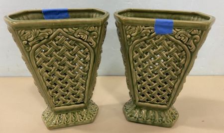 Pair of Kirkland's Oblong Vases, green with crackle design, ceramic, 11"h., 8"w. Pair of Kirkland's Oblong Vases, green with crackle design, ceramic, 11"h., 8"w.