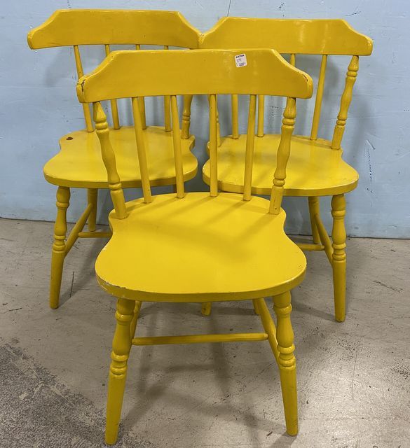 Three Painted Yellow Spindle Back Chairs, average condition. Three Painted Yellow Spindle Back Chairs, average condition.