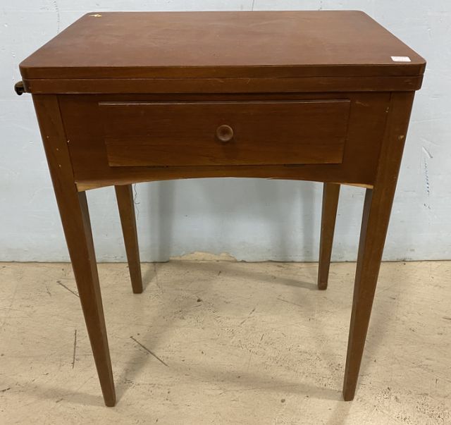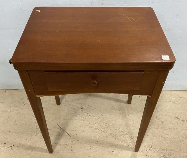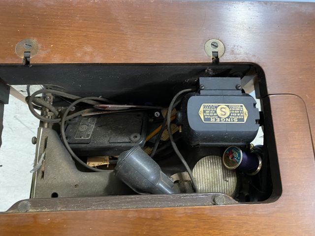 Vintage Singer Sewing Machine in Cabinet, mahogany veneered, has chips, 30"h., 23"w. Vintage Singer Sewing Machine in Cabinet, mahogany veneered, has chips, 30"h., 23"w.