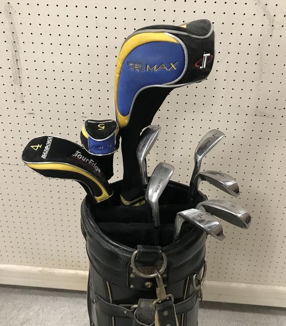 Tour Edge golf set, rescue clubs, irons, and driver. Tour Edge golf set, rescue clubs, irons, and driver.