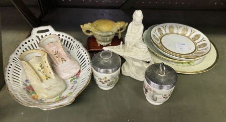 Porcelain plates, Buddha, spice containers, alabaster urns, porcelain shoes, and bowl. Porcelain plates, Buddha, spice containers, alabaster urns, porcelain shoes, and bowl.