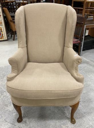 Queen Anne Wing Back Upholstered Chair, clean but has damage, worn legs. Queen Anne Wing Back Upholstered Chair, clean but has damage, worn legs.