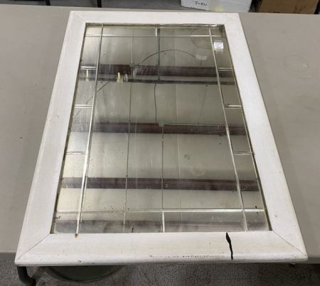 White frame wall mirror, beveled glass, 28"h., 20"w. White frame wall mirror, beveled glass, 28"h., 20"w.
