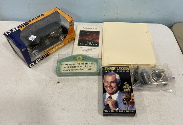 Dub City 2006 Dodge Magnum model car, dish, Tea and herbs, Johnny Carson VHS, Canon Camera, 2005 Invitation of inauguration. Dub City 2006 Dodge Magnum model car, dish, Tea and herbs, Johnny Carson VHS, Canon Camera, 2005 Invitation of inauguration.