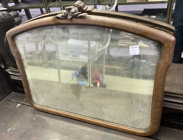 Vintage Beveled Mirror Framed, oak wood frame with carved crest, 20"h., 24"w. Vintage Beveled Mirror Framed, oak wood frame with carved crest, 20"h., 24"w.
