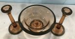 Amber glass console set, compote and matching Candle sticks, with silver plate rimmed, 8 1/2"h. Amber glass console set, compote and matching Candle sticks, with silver plate rimmed, 8 1/2"h.