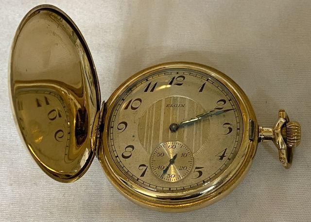 1923 Elgin Gold Filled Pocket Watch, model 6, grade 386, size 16s, 17 jewels, monogrammed, Hunters case, 25 year gold filled, serial 25328839, good condition. It will run. 1923 Elgin Gold Filled Pocket Watch, model 6, grade 386, size 16s, 17 jewels, monogrammed, Hunters case, 25 year gold filled, serial 25328839, good condition. It will run.