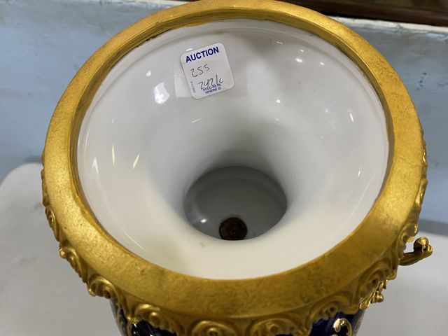 Sevres Style French Porcelain Urn, ormolu cherubs, gold gilt painted, Hunting Portrait Family, gold painted base, vintage antique reproduction, like new, 27"h. Sevres Style French Porcelain Urn, ormolu cherubs, gold gilt painted, Hunting Portrait Family, gold painted base, vintage antique reproduction, like new, 27"h.