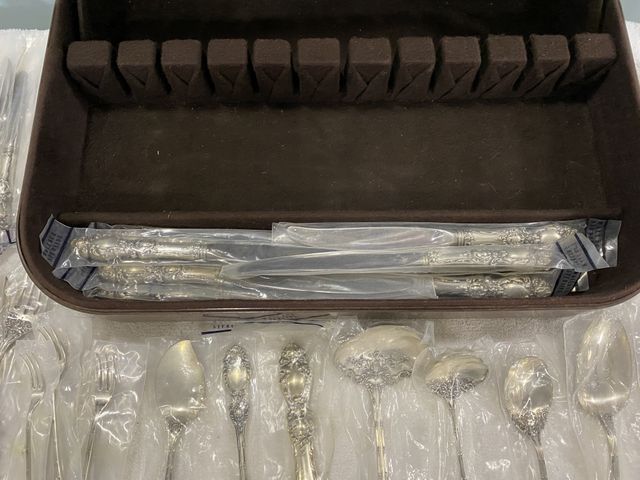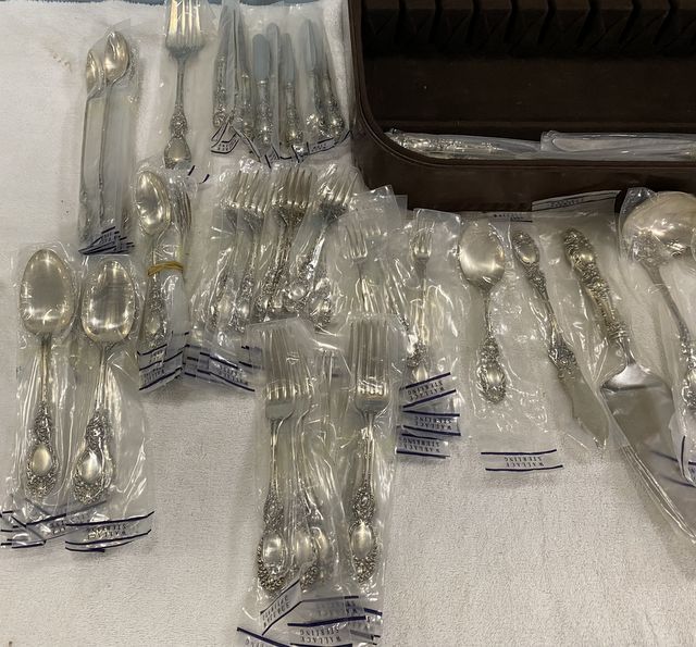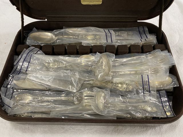 Wallace "Lucerne" Sterling Flatware, pattern Lucerne, in plastic wrappers, 12 salad forks, 8 dinner forks, 8 place spoons, 8 tea stir spoons, 8 large spoons, 8 butter knifes, 9 cock tail forks, cream spoon, butter knife, pie server, two ladles, serving spoons, serving forks, meat fork, 67.880 ozt, knives not included in weight, box included. Wallace "Lucerne" Sterling Flatware, pattern Lucerne, in plastic wrappers, 12 salad forks, 8 dinner forks, 8 place spoons, 8 tea stir spoons, 8 large spoons, 8 butter knifes, 9 cock tail forks, cream spoon, butter knife, pie server, two ladles, serving spoons, serving forks, meat fork, 67.880 ozt, knives not included in weight, box included.