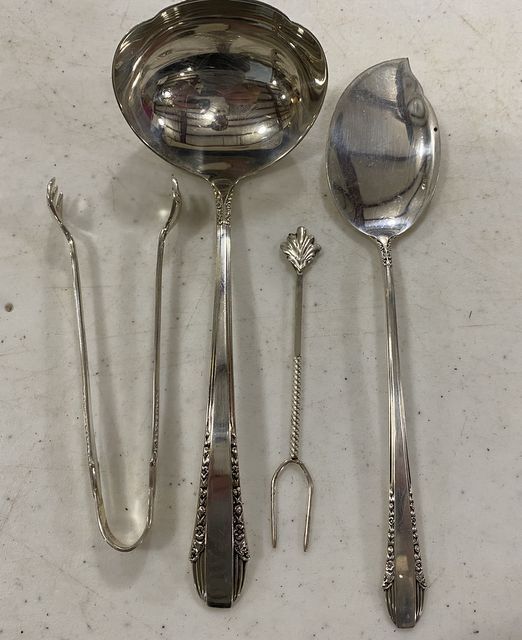 International "Enchantress" Sterling Serving pieces, cream spoon, ladle, tongs, and non matching cock tail fork. 3.350 ozt. International "Enchantress" Sterling Serving pieces, cream spoon, ladle, tongs, and non matching cock tail fork. 3.350 ozt.
