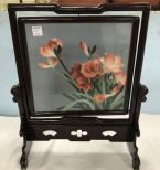 Chinese Hand Embroidered Silk Flowers Double Sided Convex Glass Table Screen, black lacquer stand, antique replica, 20"h., 16"w. Chinese Hand Embroidered Silk Flowers Double Sided Convex Glass Table Screen, black lacquer stand, antique replica, 20"h., 16"w.