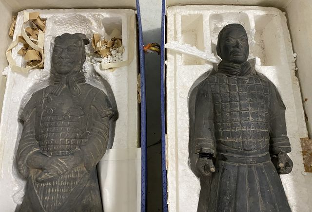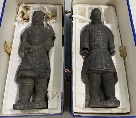 Pair of Chinese Tomb Pottery Statues, replicas, in original boxes, 13"h. Pair of Chinese Tomb Pottery Statues, replicas, in original boxes, 13"h.