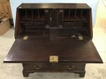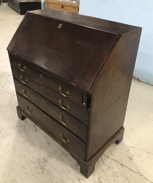 Late 18th Century to Early 19th Century Mahogany Secretary, drop front writing desk, four drawers, Chippendale style, unusual two piece sections, dove tailed, has age and finish wear, 40"h., 36"w., 19"d. Late 18th Century to Early 19th Century Mahogany Secretary, drop front writing desk, four drawers, Chippendale style, unusual two piece sections, dove tailed, has age and finish wear, 40"h., 36"w., 19"d.