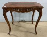 Vintage Depression Era French Parlor Side Table, walnut with inlay designs, carved base, has finish wear, 23"h., 26"w. Vintage Depression Era French Parlor Side Table, walnut with inlay designs, carved base, has finish wear, 23"h., 26"w.