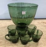 Green Glass Punch Set, footed Bowl 10"h., 11"dia. and 6 cups Green Glass Punch Set, footed Bowl 10"h., 11"dia. and 6 cups