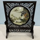 Chinese Hand Embroidered Silk Landscape Double Sided Convex Glass Table Screen, oval, black lacquer stand, new, missing one metal storage pin, 22"h., 16"w. Chinese Hand Embroidered Silk Landscape Double Sided Convex Glass Table Screen, oval, black lacquer stand, new, missing one metal storage pin, 22"h., 16"w.