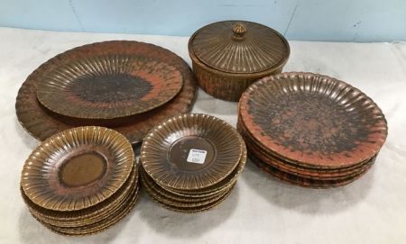 Set of Stangl Stoneware Pottery, burnt orange, two platters, covered tureen, saucers, plates. Set of Stangl Stoneware Pottery, burnt orange, two platters, covered tureen, saucers, plates.