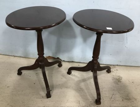 Pair of Bombay Company Tilt Top Tables, cherry finish, pedestal, light wear, oval tops, 20"h., 18"w. Pair of Bombay Company Tilt Top Tables, cherry finish, pedestal, light wear, oval tops, 20"h., 18"w.