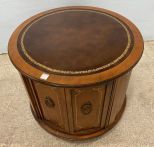Vintage Round Leather Top Commode Table, inlaid style design, double door, light wear, 21"h., 25"w. Vintage Round Leather Top Commode Table, inlaid style design, double door, light wear, 21"h., 25"w.