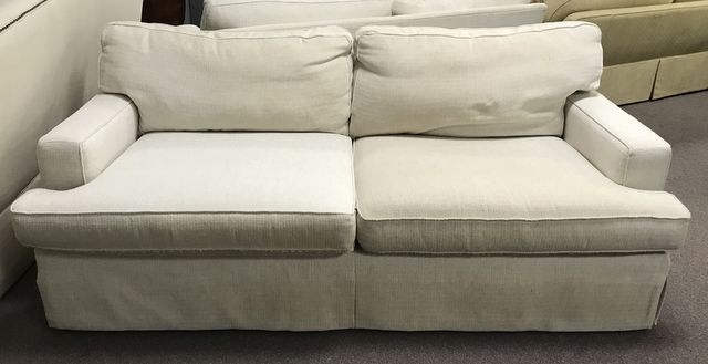 CR Laine Upholstery Designer Sofa, two cushions, eggshell white, needs cleaning, has some dirt, 6'9 long, 31"d. CR Laine Upholstery Designer Sofa, two cushions, eggshell white, needs cleaning, has some dirt, 6'9 long, 31"d.